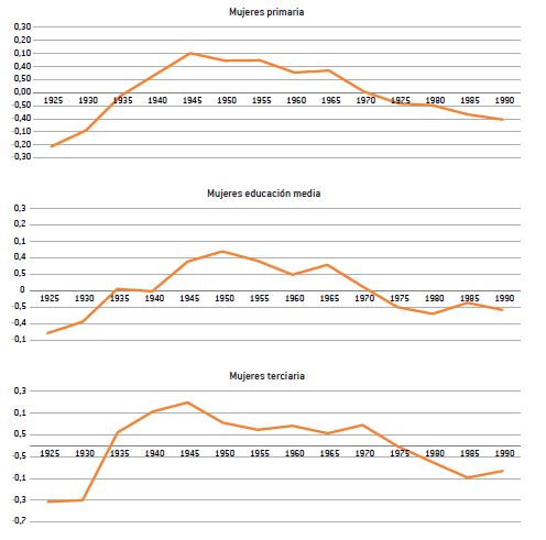 Las mujeres de educación media se encuentran en valores intermedios del desvío estándar de los coeficientes de cohorte y también en la histéresis (significa que irá disminuyendo el efecto a medida que envejezcan, pero con baja intensidad). Las cohortes más jóvenes tienen desvíos negativos, pero cercanos a la tendencia lineal.