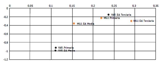Finalmente, se introduce como variable independiente el nivel educativo, factor también relevante para explicar el desempleo de acuerdo a la literatura sobre el tema. Como ya se analizó, los coeficientes de APCD por nivel educativo son altos tanto para las mujeres como para los varones. Gráfico 4.