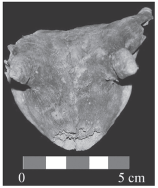 The center of the ventral lower pharyngeal jaw has a well-defined suture, with small undulations (Fig. 2). Its length along the outer margin is 83.79 mm, and the maximum width between the muscular processes (between postero-lateral angles) is 86.70 mm. In dorsal view (Fig. 3), the mandible is divided in two by a mandibular sym-physis of 59.67 mm of length and 1.75 mm wide. The left lower pharyngeal has an incomplete dentition, possessing a total of 58 teeth, of which 44 are crushing teeth and 14 sharp teeth. The right lower pharyngeal also has an incomplete dentition, only 15 small crushing teeth in the lateral angle, with a maximum anteroposterior length of 5.31 mm and a maximum width of 8.86 mm.