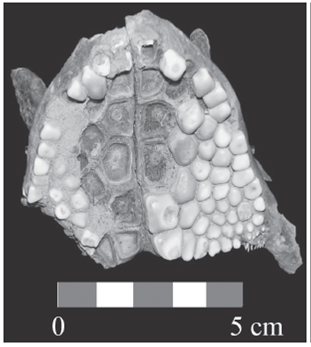 However, it has some juvenile characteristics such as the presence of molariform teeth in the central region and sharp denticles preserved on the postero-lateral angles. The jaw is in good condition but is not complete. The keel left of the ceratobranchial is totally torn, whereas the right keel is damaged in its edge. The dentition also is incomplete, and does not have many of teeth at the left central portion.