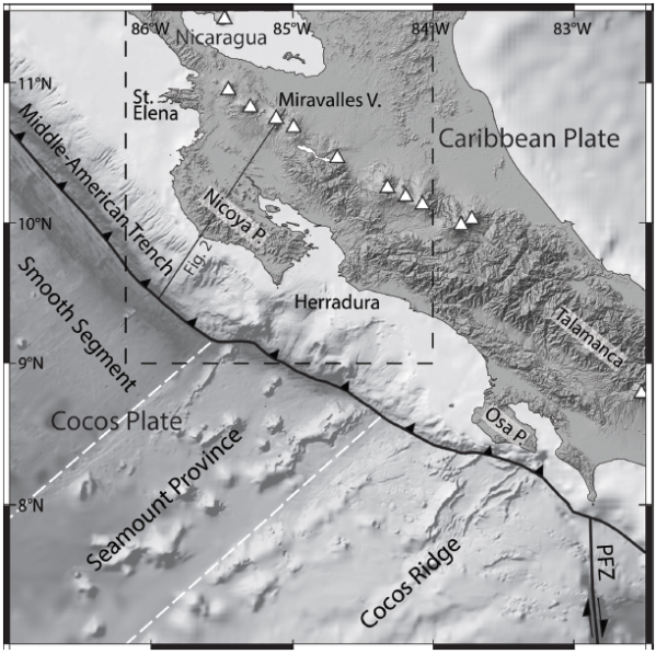 The structure of the Costa Rican subduction zone is heavily influenced by the heterogeneity of the subducting Cocos plate. Upon its arrival at the Middle American Trench offshore Costa Rica, this plate is segmented in three morpho-tectonic domains defined by von Huene et al. (2000) as: a northwestern section with smooth bathymetric relief, a central sea-mount segment and a northeastern segment marked by the presence of the Cocos Ridge (Fig. 1).