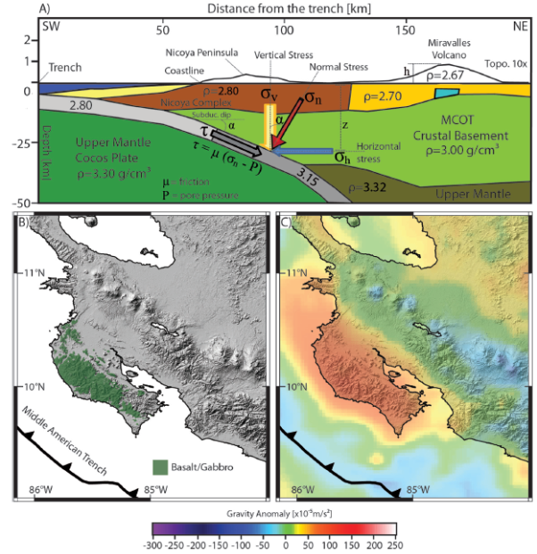 In the case of the Chilean forearc, studied by the abovementioned authors, the stress anomalies are caused by dense material from mafic intrusive rocks originated from magmatic processes related to the Jurassic volcanic arc. The stress anomalies observed along the Nicoya Peninsula are caused by basalts and gabbro belonging to the Nicoya Complex, an accreted terrain of ancient oceanic crust. The presence of these dense rocks on top of the seismogenic zone is corroborated by surface geology (Denyer et al., 2014) and result in Bouguer anomalies highs reaching 120><10-5 m/s2 in this area. The density distribution of the forearc on the location of this gravity anomaly modeled in three dimensions by Lücke (2012) is the input for the stress calculations in this research.