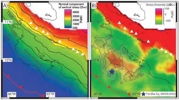 The results show an elongated, NW-SE trending positive stress anomaly along the western part of the Nicoya Peninsula. The location of this anomaly correlates with the zones of highest seismic coupling of the seismogenic zone modeled by Feng et al. (2012).