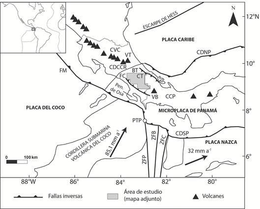 La región en estudio se encuentra en una zona de convergencia de placas (Fig. 1), en que la placa del Coco se subduce bajo la placa Caribe y la microplaca de Panamá. Considerando un anteraco fijo, la placa del Coco se aproxima a la península de Osa a 85,1 ± 4,2 mm por año en dirección N28°E, según un modelo tridimensional desarrollado por LaFemina et al. (2009). En este trasfondo, la cordillera de Talamanca se encuentra en una disposición aproximadamente paralela a la fosa Mesoamericana, al igual que el arco volcánico centroamericano que se extiende desde Guatemala hasta la región central de Costa Rica prácticamente sin interrupciones. Sin embargo, es notable la ausencia de volcanes recientes (de 1 millón de años o menos) a lo largo de unos 175 km, espacio ocupado por la cordillera de Talamanca y los conjuntos de serranías que la flanquean. Ya Kolarsky, Mann y Montero. (1995) habían demostrado que este espacio sin estratovolcanes entre los volcanes Turrialba en Costa Rica y Barú en Panamá, tiene una anchura similar a la porción más somera de la cordillera del Coco, un rasgo geomorfológico destacable en la placa del Coco.