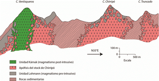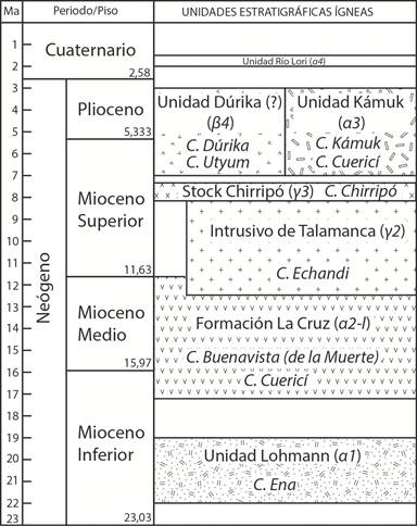La tercera parte la constituyen las rocas ígneas posteriores al intrusivo principal, que aquí se ha dividido en unidades Kámuk, Dúrika y Río Lori. En este apartado se explica cada una de las unidades propuestas. La figura 2 representa la idea estratigráfica del presente trabajo. Los códigos de las unidades en este apartado corresponden con los del mapa adjunto.