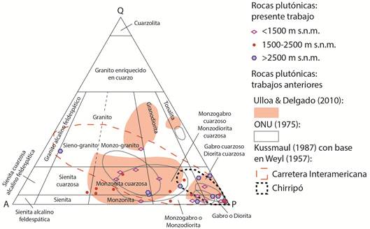 El Intrusivo de Talamanca está constituido fundamentalmente por monzonitas cuarzosas, monzonitas, monzodioritas o monzogabros, granitos y granodioritas hacia los flancos de la cordillera (los sectores de menor altitud) y gabros y dioritas en las partes más altas, por lo general sobre los 2500 m s.n.m. (Alfaro, 2017; Fig. 4). La arenitización es muy frecuente, y es común observar bloques redondeados por meteorización esferoidal, rodeados de subproductos de la arenitización que a veces conservan la textura granular.