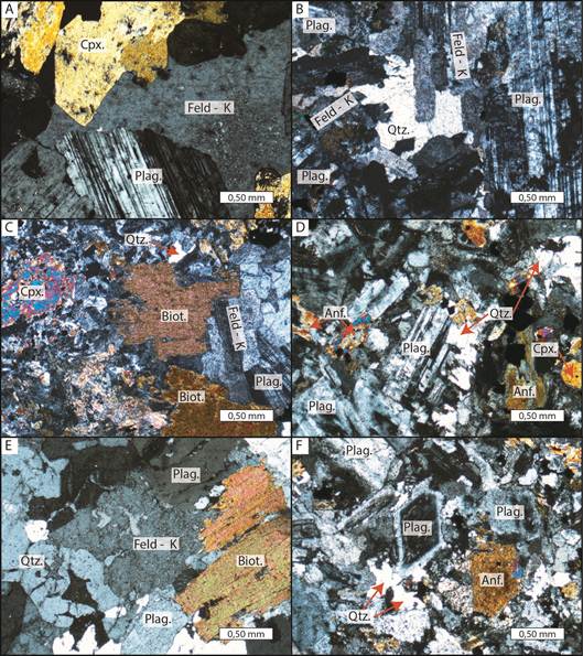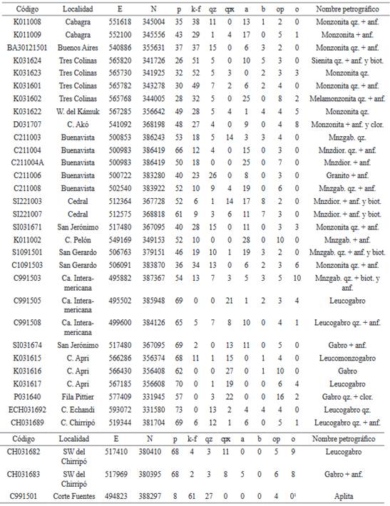 Petrográficamente, las rocas intrusivas de Talamanca presentan principalmente plagioclasa, ortosa, cuarzo, anfíbol y clinopiroxeno, como se observa en la figura 5 (Weyl, 1957; Kussmaul, 1987; Abratis, 1998; Gräfe, 1998; Obando y Kussmaul, 2009; Ulloa y Delgado, 2010; Alfaro, 2017). La plagioclasa varía entre andesina y labradorita, y es el feldespato dominante; solo en Tres Colinas (muestras de las coordenadas P11) y Corte Fuentes (C991501, coordenadas B2) se encontraron rocas plutónicas con mayores cantidades de feldespato potásico. El cuarzo rara vez alcanza el 20% de la muestra (ver Cuadro 2).