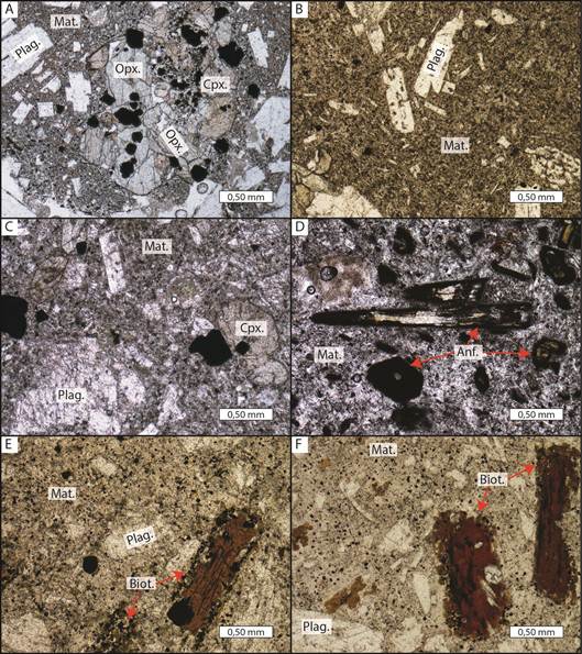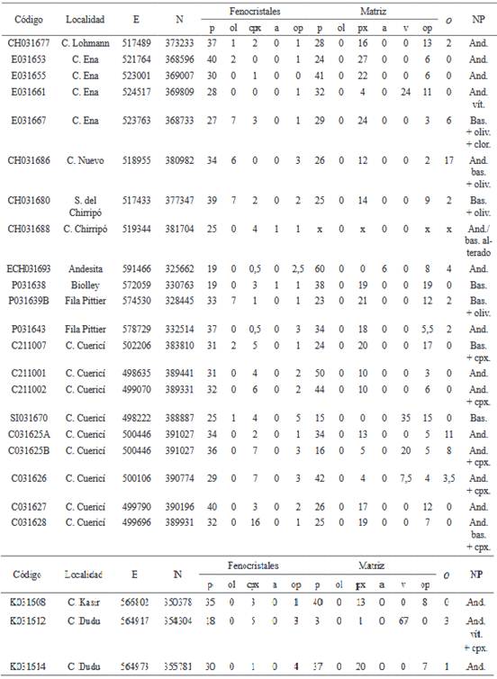 Para las rocas ígneas volcánicas o subvolcánicas más jóvenes que 10 millones de años, los criterios de diferenciación petrográfica entre las unidades definidas son principalmente los minerales ferrogmanesianos. La presencia de ortopiroxeno (Gazel et al., 2009) se ha considerado un aspecto que permite identificar rocas ígneas posteriores al Intrusivo de Talamanca, conocidas para la región axial de la cordillera como Unidad Kámuk, mientras que la biotita es frecuente en rocas que conforman un grupo bien definido con tendencia alcalina, denominado Unidad Dúrika (ver Figura 7).
