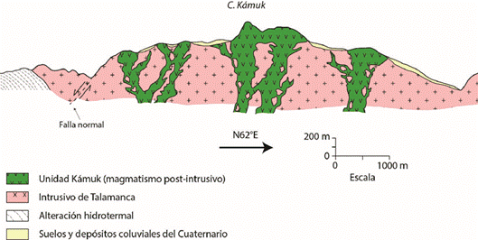 En el caso del Kámuk, se sugiere que el Intrusivo de Talamanca constituye la mayor proporción del macizo, pero no su cima absoluta (Fig. 8). La cima se interpreta como un criptodomo, es decir, un cuerpo magmático acumulado cerca de la superficie sin llegar a aflorar. Las irregularidades en torno a la cima podrían ser también explicadas mediante la idea de los criptodomos. Gabb (1874, pág. 106) ya había sugerido algo similar:
