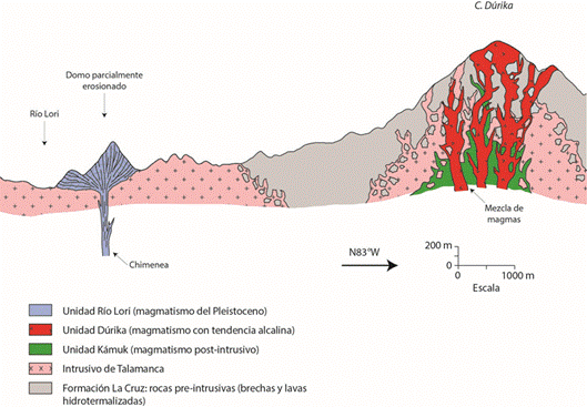 Se interpreta que las unidades Kámuk y Dúrika que afloran en los sectores más elevados de la cordillera son en su mayoría cuerpos hipoabisales (criptodomos) y no productos de vulcanismo post-intrusivo; es decir, estos productos, si los hubo, ya están erosionados. Los únicos productos de vulcanismo efusivo o explosivo hacia las partes altas de la cordillera corresponden con la Unidad Río Lori, domos edificados sobre los plutones ya erosionados.