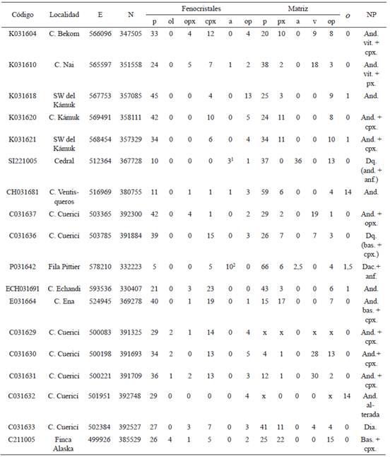 La Unidad Kámuk está constituida fundamentalmente por andesitas y andesitas basálticas, aunque también hay dacitas que se asocian con este grupo. En todos los casos la textura es afanítica porfirítica; a simple vista sobresalen fenocristales de plagioclasa, rodeados de una matriz gris en donde se observan minerales ferromagnesianos, principalmente clinopiroxenos. El ortopiroxeno es un buen indicador de esta unidad (ver cuadro 3). Ya Gazel et al. (2009), con base en dataciones y observaciones petrográficas, habían afirmado que el ortopiroxeno aparece como fenocristal durante el Mioceno Superior, lo que se ajusta a las edades propuestas para la Formación Grifo Alto (Alvarado y Gans, 2012), que varían entre 7,30 y 3,50 millones de años según dataciones 40Ar/39Ar.