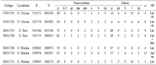 Otros componentes de las latitas de la Unidad Dúrika son feldespato potásico (posiblemente anortoclasa, 0-11%), piroxeno (0-3%) y anfíbol (0-2%). La matriz puede ser muy cristalina o vítrea (ver cuadro 4). Hay evidencias de mezcla de magmas, como en el caso de la muestra U031701 (coordenadas M7, cima del Utyum), donde la sección delgada presenta sectores de constitución latítica, como la Unidad Dúrika, y andesítica, como la Unidad Kámuk. Es probable, por tanto, que ambas unidades hayan coexistido.