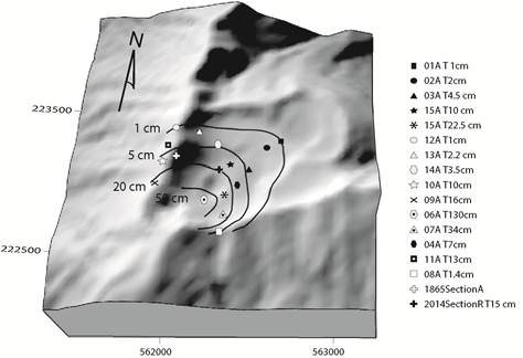 El transporte por suspensión es fácilmente asociable a aquellas muestras recolectadas a una decena de kilómetros del cráter. En el otro extremo, los fragmentos recolectados cerca de la fuente generalmente serían asociados a procesos balísticos. Sin embargo, las muestras del Grupo 1 cercanas a la fuente tienen mayoritariamente un tamaño que excluyen el transporte balístico, por lo que en este trabajo se asociarán a una mezcla en proporciones variables de tracción y de saltación (oleada), pues considerarse que los modelos nopermiten discriminar entre ambos procesos.