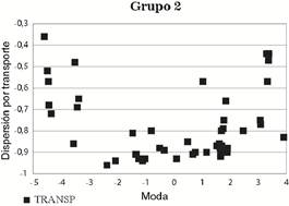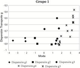 La sustitución de la desviación estandard por la dispersión promedio g es una posición híbrida que en lo fundamental mantiene la posición de Folk, en lugar de adoptar la visión de SFT. Según Sheridan et al. (1987) a cada una de las sub-poblaciones identificadas al aplicar SFT a una granulometría específica debe asociarse un proceso de transporte específico. Por lo tanto, cada sub-población debería entonces ser analizada utilizando su valor de dispersión de transporte g asociado. Empíricamente se encuentra que las sub-poblaciones de todas las granulometrías de las muestras de los grupo 1 y 2 tienden a agregarse alrededor de valores de moda similares. Por ello, en lo que sigue en este trabajo se denominará proceso de transporte a cada uno de esos agregados de subpoblaciones.