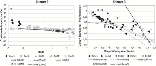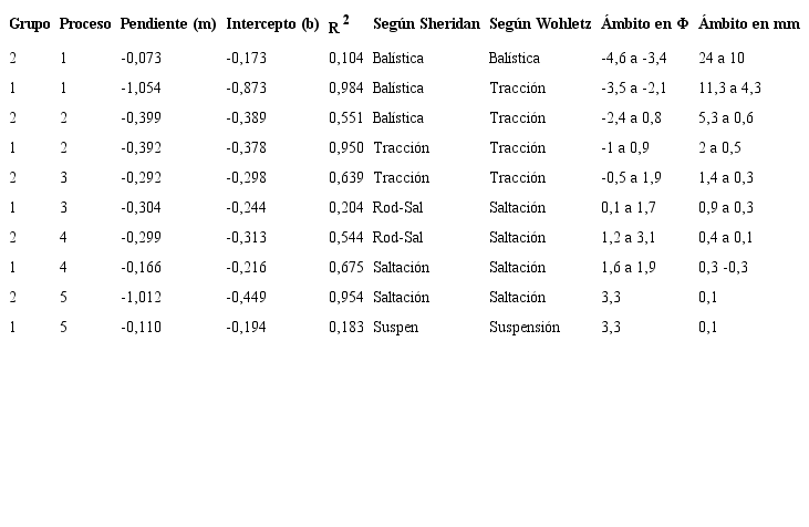 Según se observa en el cuadro 8, 7 de las 10 relaciones tienen asociadas valores de R2 mayores a 0,5, y para 3 de esas 7 el valor de R2 es muy cercano a la unidad, lo que sugiere que reflejan uno o varios fenómenos físicos presentes durante el transporte de los fragmentos, pues se han generado partiendo de muestras localizadas en diversos lugares, recolectadas en tiempos y en condiciones bastante diferentes. En el Cuadro 8 se observa todas las pendientes e interceptos son valores negativos entre 0 y la unidad. Además, los asociados a los procesos 2, 3 y 4 son muy parecido, de manera similar a lo que se observa en el gráfico de coeficiente de fragmentación versus moda (Figura 6b).