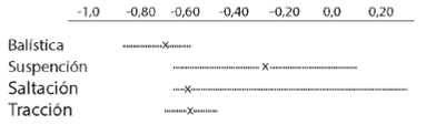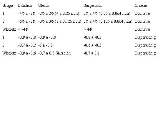 Siguiendo esa lógica, tres procesos pueden identificarse (Fig. 4): el proceso 5 con sub-poblaciones con modas entre 3 a 4Φ y valores de g entre -0,8 y -0,3, que podría asociarse a transporte por suspensión. El proceso 1 compuesto por sub-poblaciones con modas en el ámbito de -4Φ a -2Φ y valores de g entre -0,9 y -0,8, que se asociaría con transporte balístico. Y tres procesos con sub-poblaciones en el ámbito de -2Φ a 2Φ. Los procesos 2 y 4, con valores de g entre -0,9 y -0,8, se asociarían a oleadas por su tamaño. El proceso 3, por tamaño debería también ser considerado como una oleada, pero los valores de g sugieren algunos casos de oleada modificada por suspensión, situación para la cual no se puede presentar ninguna explicación.