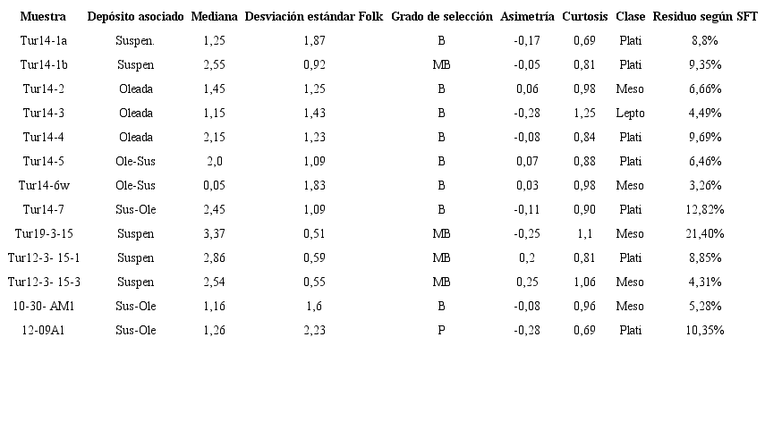 Los parámetros de Folk fueron obtenidos con ayuda del programa SFT. Aunque los parámetros estadísticos calculados según Folk son comunes en la literatura, estos deben, sin embargo, ser tomados con cautela. Si bien no se utilizaron intervalos menores a 1Φ, se advierte que no se evaluó si el ámbito de los parámetros estadístico es lo suficientemente grande, como previenen Swan et al. (2006).