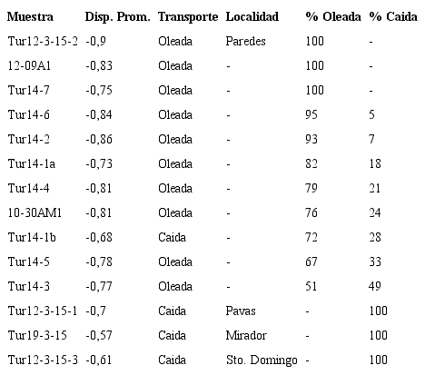 En resumen, el análisis de los resultados sugiere que las muestras fueron recolectadas en una parte en que el material se transportaba como una mezcla de una parte oleada diluida sobrepuesta en una corriente granular. Por ende, el depósito está dominado por las colisiones entre las partículas y los esfuerzos cortantes altos (número de Savage mayor a 0,1) (Savage y Hutter, 1989). De ser así, se esperaría que para muestras recolectadas más lejos de la fuente el número de Reynolds asociado se reduciera, pasándose de un flujo turbulento a uno laminar. Las partículas suspendidas en el flujo debido a la turbulencia podrán entonces irse depositando, variando el contraste de densidad de los dos flujos (Valentine, 1987; Dellino et al, 2008)
