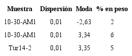 Esta aproximación al problema, sin embargo, presenta una serie de inconsistencias. Por ejemplo, la muestra Tur14-1b debería ser asociada a suspensión (dispersión promedio de g = -0,68) (como se consideró en Folk), pero presenta un 72% de componente de oleada.