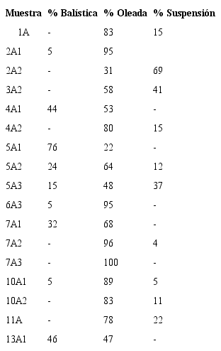 Todas, excepto una, de las sub-poblaciones con moda en el ámbito de -5Φ a -3Φ y dispersión g entre -0,7 y -0,3 se agrupan en el proceso 1 asociado a transporte balístico. La excepción corresponde al 24% de la muestra 5A2 (moda -3,56 Φ y g -0,86), que se considera como balística modificada por oleada dada la proximidad con el siguiente grupo. Las observaciones anteriores se resumen en el Cuadro 5.