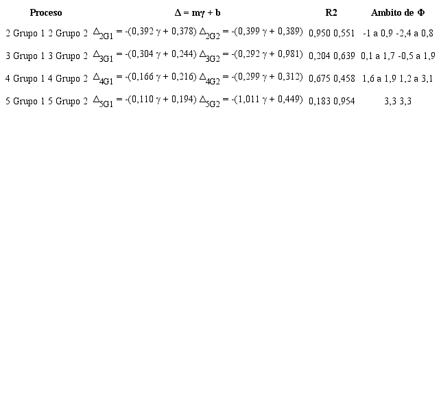 Llama la atención que el mismo resultado se obtiene en el gráfico de Δ versus γ. La recta asociada al Proceso 4 muestra un R2 de 0,1904 si las dos muestras se asocian al proceso 5 (R2 = 0,2176). Si en cambio las muestras se asocian al proceso 4, su R2 aumenta apreciablemente a 0,6752, en tanto que el R2 del proceso 5 apenas disminuye a 0,1831.