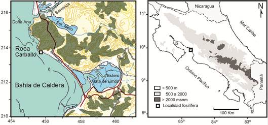 El material objeto de estudio del presente trabajo, fue colectado en la base del afloramiento de Roca Carballo, en las coordenadas 9°56’27’’ N y 84°44’04’’ W, en el acantilado homónimo y procede de un banco de lutitas y areniscas rojizas, volcanogénicas, sobreyacidas por areniscas finas a medias, color verdoso con estratificación cruzada de bajo ángulo y abundantes restos de moluscos e ichnofósiles correspondientes al Miembro Roca Carballo (Fig. 1).