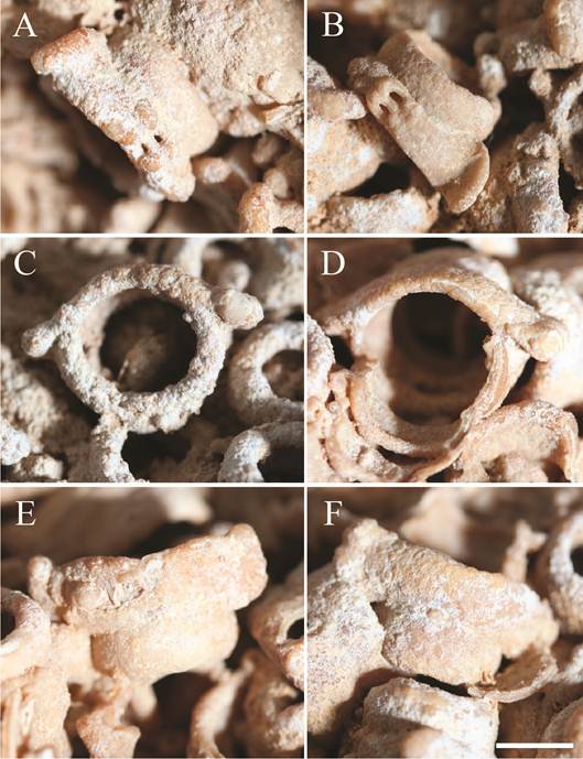 Es claro que dichos segmentos corresponden a individuos diferentes y en diferentes estadios ontogenéticos, en la figura 4A, se ilustra un ejemplar de individuo juvenil donde es notable su pequeña talla. Por su parte, la numerosa acumulación de segmentos puede deberse a diversos factores, pero no necesariamente a la muda simultánea de varios individuos.