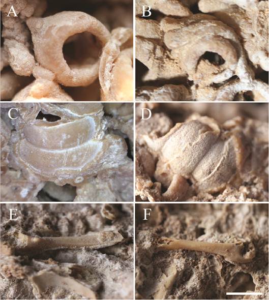 Los bordes externos de los paranota en general son lizos con ligeras proyecciones en los extremos anteriores y redondeados en su porción posterior (Fig. 3B, E, F). Sin embargo, en algunos ejemplares, como los ilustrados en la figura 3D y F, se observa que el margen externo de los paranota está dividido en dos lóbulos que se confunden con pequeñas acreciones por el carbonato de calcio que las recubre (Fig. 3D, F). Todas estas características están presentes en el género Nyssodesmus, un género muy común en Costa Rica y América Central.