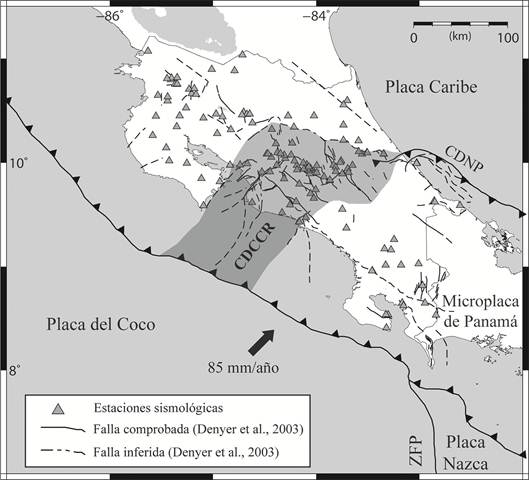 Costa Rica es un país altamente sísmico, con la influencia de un punto triple en donde la Fosa Mesoamericana, que termina contra la Zona de Fractura de Panamá (ZFP), separa las placas del Coco y Caribe. La placa del Coco se subduce por debajo de la placa Caribe y la microplaca de Panamá a una velocidad promedio de 8,5 cm/año (DeMets, 2001). La ZFP sirve de límite entre las placas del Coco y Nazca al sur de Costa Rica y Panamá, mientras que el Cinturón Deformado del