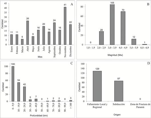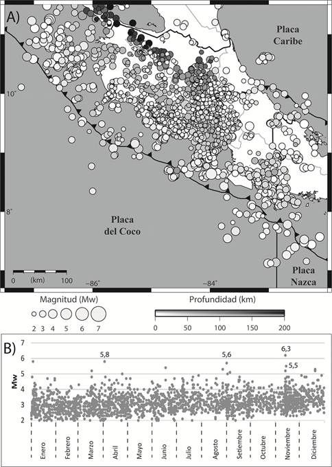 Marzo y noviembre fueron los meses con la menor y mayor cantidad de sismos sentidos (6 y 41), respectivamente (Fig. 4A). Los meses restantes variaron entre 9 y 26 eventos sentidos (Fig. 4A). Los sismos de mayor Mw dentro del territorio costarricense ocurrieron en abril (5,8), setiembre (5,6) y noviembre (6,3 y 5,5). El promedio mensual de sismos sentidos fue de 17,1.