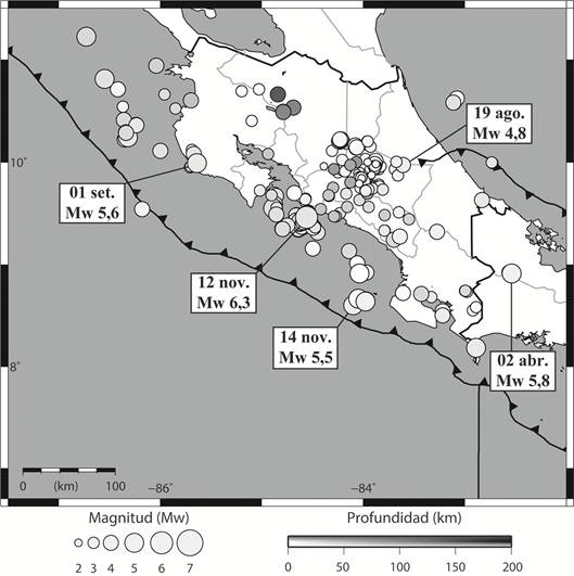 Los sismos más relevantes en la zona de Jacó (zona A) tuvieron Mw de 6,3 y 5,2 (12 de noviembre) y 4,9 (3 de diciembre). En esta zona, 20 sismos sentidos tuvieron Mw > 4,0. En las zonas de los volcanes Irazú y Poás (zonas B y C), los sismos más importantes tuvieron lugar el 27 de setiembre (Mw 4,4) y el 20 de julio (Mw 4,8), respectivamente.