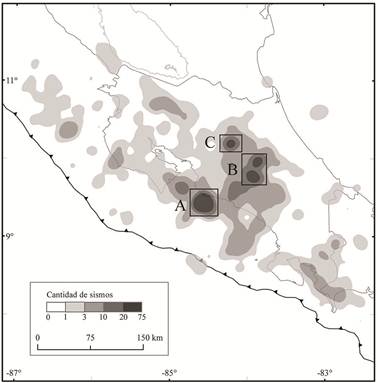 Las tres regiones con la sismicidad más alta se ubicaron al sur de Jacó (región A, Fig. 5), en las zonas de Cartago y el volcán Irazú (región B, Fig. 5) y en los alrededores del volcán Poás (región C, Fig. 5). En estas tres regiones ocurrieron entre 20 y 75 sismos durante el 2017. Por otro lado, la Zona Norte y gran parte del Caribe y la cordillera de Talamanca se caracterizaron por una sismicidad muy baja, con menos de tres sismos por cada 100 km2.