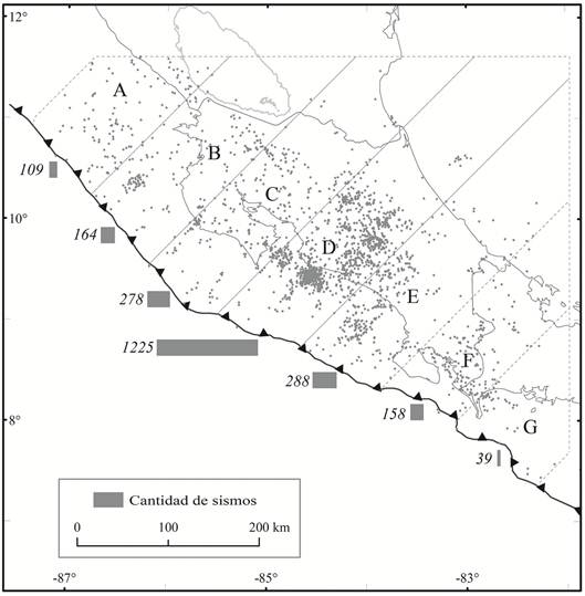 Si se analiza la distribución de la sismicidad a lo largo del margen convergente de la placa del Coco con la placa Caribe y la microplaca de Panamá, es posible observar que la franja más activa comprende la parte central del país, con un total de 1167 sismos, donde ocurrió el sismo de Jacó (Mw 6,3) el 12 de noviembre (región D, Fig. 6). En contraste, la franja con menor sismicidad sentida es la región sureste del país, con tan sólo 153 eventos (región F, Fig. 6).