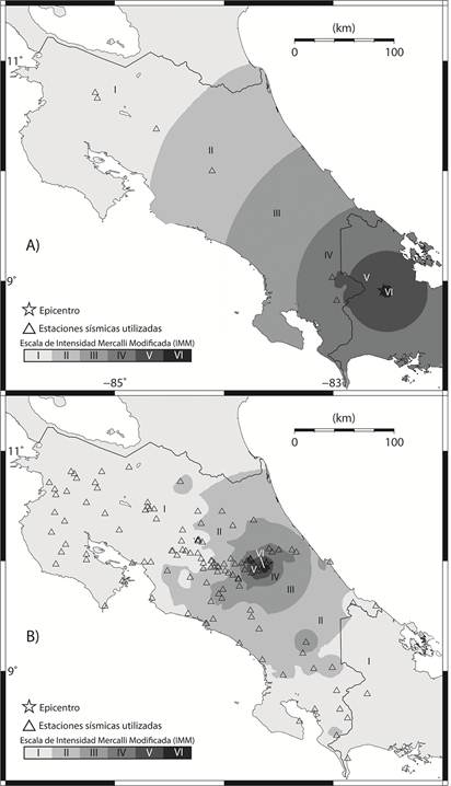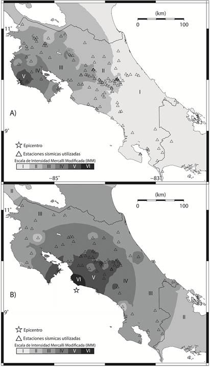 Durante el 2017 ocurrieron cuatro eventos sísmicos que generaron una intensidad en la escala Mercalli Modificada (IMM) de V a VI+. Estas intensidades fueron determinadas con base en los registros instrumentales de las estaciones sismológicas de la RSN y a través del software ShakeMap (Wald, D. Wald, L. Worden & Goltz, 2003) que utiliza un modelo de predicción del movimiento de suelo (Zhao et al., 2006) y uno de intensidad (Wald et al., 1999).