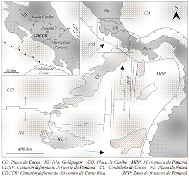 Costa Rica forma parte del Istmo Centroamericano (placa Caribe (CA)), frente a su costa pacífica se encuentra la zona de subducción donde la placa de Cocos (CO) se desliza bajo la placa Caribe con velocidad cercana a 90 mm por año (DeMets, 2001). La región presenta un alto grado de actividad debido a la interacción de los centros de expansión del Pacífico Este, que limitan la placa Pacífica (PA) con la de Cocos el centro de expansión de Nazca, donde limitan la placa de Cocos y Nazca. Este último centro de expansión ha coincidido con el punto caliente de las Islas Galápagos (IG), generando varias cordilleras submarinas como la Cordillera de Cocos (CC) que, con su interacción con la placa de Caribe mediante la subducción han propiciado que se generen estructuras como la Zona de Fractura de Panamá (ZFP), la Microplaca de Panamá (MPP) y varias condiciones geológicas particulares en Costa Rica, donde la presencia de un arco volcánico predominantemente andesítico y velocidades de onda-P sugieren la evolución de una Corteza oceánica a continental (Gazel et al., 2015).