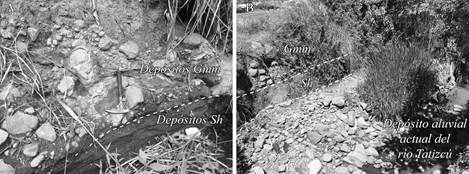 Las facies Sh se observan únicamente en algunos afloramientos, donde el paquete de sedimentos lo suficientemente expuesto. Están compuestas por arenas de grano fino a medio, con cantos esporádicos, laminación horizontal y tonalidad parda. La parte superior de las facies Sh no presenta bioturbación. Sobre estos materiales se presentan las facies Gmm, formadas por cantos angulosos poco seleccionados, soportados por matriz arcillosa, sin laminación ni estructuras sedimentarias evidentes.