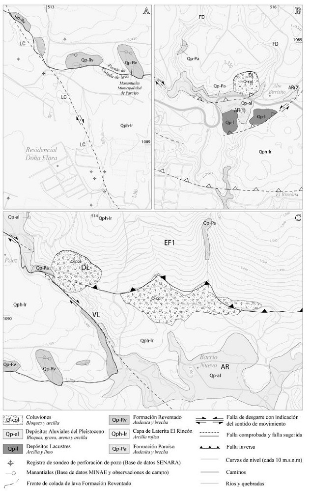 Abstract: This paper presents the data derived from the geological mapping of the Paraíso sheet (3445-IV23), 1:10.000 scale, located within the Central Valley of Costa Rica, together with the most relevant structural and hydrogeological aspects. In general, the existence of a rocky basement associated with the Pacacua Formation of the Upper Miocene, discordantly overlain by materials from the Irazú paleovolcano, related to the Paraíso Formation of the Middle Pleistocene and to the Reventado Formation of the Upper Pleistocene was determined. Due to the climatic conditions and to the composition of the volcanic materials the unit El Rincón Laterite Bed has been developed, which appears in the greater part of the sheet. The above materials are overlaid discordantly by the Upper Pleistocene Alluvial Deposits and by the Lacustrine Deposits, whereas the Current Alluvial Deposits overlap discordantly to the previous materials due to changes in the base level of the rivers produced by the active tectonics in the region. According to morphological observations, a structural model with an axis of N-S orientation stresses, consisting of E-W orientation inverse faults, with shear faults associated with NE-SW and NW-SE orientation is proposed. The hydrogeological model is formed by two aquifers associated with lava flows, with intermediate capacity and affected by the effects of tectonic activity in the sector E of the quadrangle.