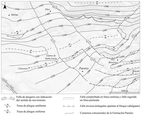 Montero et al. (2013) señalan la presencia de una de estas estructuras e indican algunas de las evidencias morfológicas de la misma, mientras que en este trabajo se determinó que presentan algunas morfologías asociadas como cursos fluviales desviados, deslizamientos y aluvión represado, así como evidencias hidrogeológicas como efluencia de manantiales. El mapa de contornos estructurales sugiere la presencia de pliegues antiformes y sinformes paralelos a las trazas de dichas fallas.