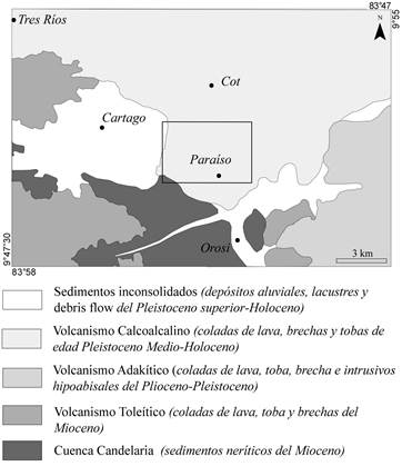 Los aspectos geológicos regionales han sido definidos para el sector central-este de Costa Rica por varios autores, que en general señalan la coexistencia de rocas sedimentarias asociadas a la cuenca de Candelaria, rocas asociadas a volcanismo antiguo y actual, y sedimentos continentales de edad reciente (Figura 2). Los primeros en correlacionar dichos datos fueron Dóndoli y Chávez (1968), distinguiendo las rocas de la cuenca de Candelaria y las rocas volcánicas recientes; posteriormente, Denyer y Alvarado (2007) determinan que en la región coexisten además rocas volcánicas del Mioceno Superior.