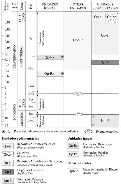 La Figura 3 muestra un esquema cronoestratigrafico sintético para el área de estudio en el que las unidades geológicas mencionadas se encuentran cartografiadas en el mapa geológico y son descritas a detalle. Dicha descripción se hace en orden cronoestratigráfico, de acuerdo con las normas estratigráficas oficiales de la International Union of Geological Sciences (Salvador, 1994). Por lo tanto, de cada unidad se exponen sus características fundamentales como: estratotipo, descripción, aspectos regionales, edad, correlación con otras unidades y otras áreas, génesis y antecedentes.