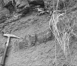 Corresponde con al menos 4 capas de materiales finos (arcillas y limos) distinguibles por su geometría, espesor y tonalidad, que varía entre amarillenta, parda y grisácea (Figura 9). Se presenta de manera aislada cerca de uno de los escarpes de las fallas inversas (la geología estructural detalla su relación con el fallamiento) en un área de apenas 300 m2, con un espesor total de aproximadamente 6 m.