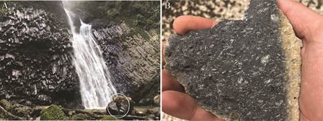 En la hoja Paraíso se presenta como una colada de lava con brechas subordinadas, con espesor mínimo de 100 m, donde sobresale la presencia de fenocristales de plagioclasa como rasgo principal (Fig. 5 B). En el afloramiento de la localidad tipo se observa el desarrollo de la colada de lava, donde los basaltos de la parte central de la misma presentan disyunción columnar y espesor cercano a los 100 m (Fig.5 A). Hacia el muro y el techo de dicho flujo basáltico se presentan brechas de tonalidades oscuras, compuestas por clastos basálticos angulosos de hasta 30 cm de diámetro, envueltos en una matriz arenosa de grano fino a medio.