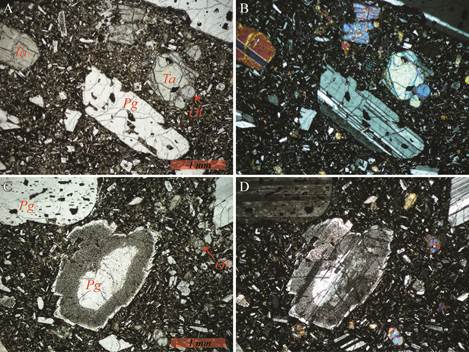 Petrográficamente se clasifica como basaltos andesíticos, con fenocristales de plagioclasa (25%), titanoaugita (15%) y olivino (7 %) (Fig. 6). La matriz está compuesta por cristalitos de plagioclasa, vidrio y olivino. Uno de los rasgos petrográficos más sobresalientes es la resorción que presentan los fenocristales de plagioclasa, la cual sugiere la interacción de dos reservorios magmáticos.
