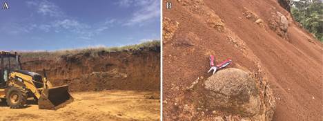 En la hoja Paraíso es la unidad de mayor extensión, ocupando más del 80 % de la superficie estudiada. Se presenta como una capa de laterita constituida por materiales de tonalidades rojizas, con la parte superior compuesta predominantemente por arcillas (Figura 7 A), mientras que hacia el muro se observa la presencia de bloques relictos de composición basáltica envueltos en una matriz de arcilla similar a la arcilla encontrada en el techo (Figura 7 B).