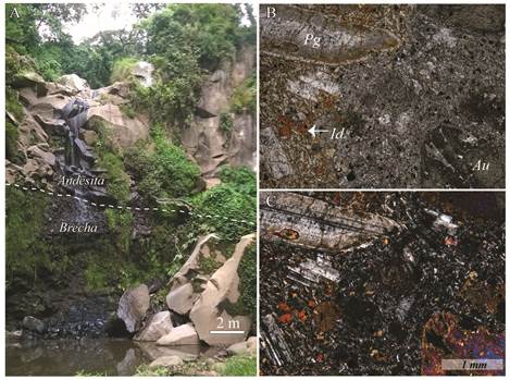 Alvarado et al. (2006) señalan se trata de coladas de lava compuestas por andesitas basálticas y andesitas con hornblenda y que dichas coladas de lava se intercalan con epiclastos. En la hoja Paraíso los afloramientos de estos materiales son escasos, presentándose como andesitas alteradas, cerca del techo de la unidad, donde es sobreyacida por la Capa de Laterita el Rincón. Se visitó un afloramiento en el río Páez ubicado 2.5 km al norte de la hoja Paraíso, en la localidad de Cot, en el cual se observa una colada de lava compuesta por un espesor de 10 m de andesita masiva de color gris, correspondiente a la parte intermedia de la colada, el cual sobreyace a una brecha lávica correspondiente a la parte inferior (Fig. 8 A). Se analizó petrográficamente dicha colada de lava (Fig. 8 B y C) y se determinó que está compuesta por fenocristales de plagioclasa, augita, olivino alterado a Iddingsita y magnetita, con matriz traquítica, compuesta principalmente por cristales de plagioclasa seriados, opacos y vidrio.