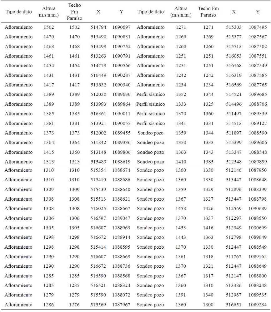 También se ha elaborado un mapa de contornos estructurales del “techo” de la Formación Paraíso, contando en primera instancia con datos de campo (afloramiento de los materiales de la Formación Paraíso) y datos derivados de los sondeos de pozos registrados por SENARA (2017). En los lugares donde hubo una falta de información se realizaron perfiles de sísmica de refracción mediante un equipo Geometrics de 12 canales (ubicación detallada en el mapa geológico). La interpolación consistió en la triangulación manual de los datos y el Cuadro 1 se muestra el tipo de dato, ubicación y profundidad de estos.