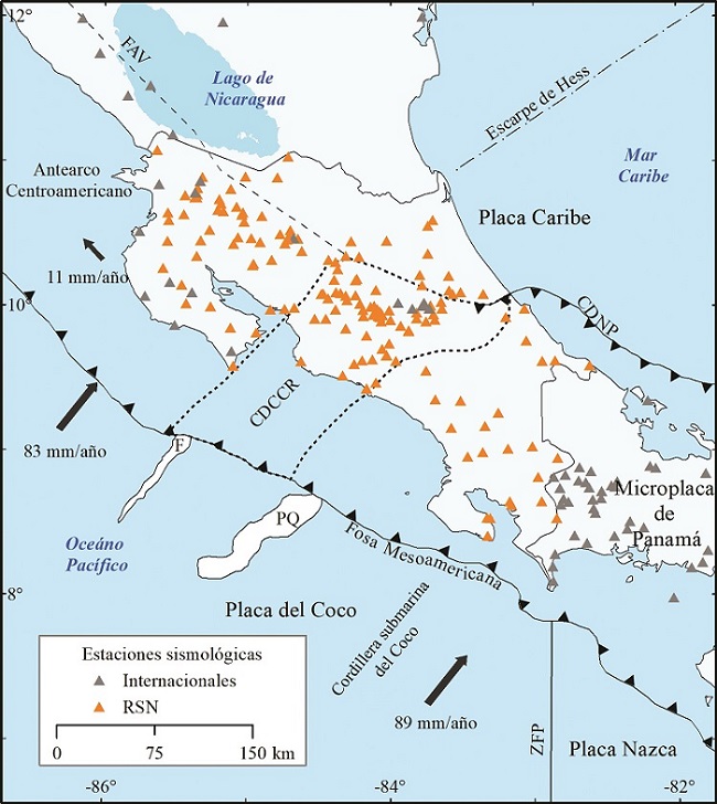Contexto tectónico de Costa Rica y estaciones de la Red Sismológica Nacional (RSN: UCR ICE). La región contenida dentro de la línea gruesa punteada representa el Cinturón Deformado del Centro de Costa Rica (CDCCR). La línea discontinua representa el límite noreste simplificado del Bloque Antearco Centroamericano a lo largo de las Fallas del Arco Volcánico (FAV) de acuerdo con Franco et al. (2012)[13]. CDNP es el Cinturón Deformado del Norte de Panamá, F es el monte submarino Fisher, P significa Plateau de Quepos, y ZFP, Zona de Fractura de Panamá.