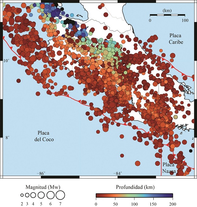 El territorio costarricense se ubica en el margen occidental de las placas Caribe y Panamá (Fig. 1) Figure 1, donde la subducción de la placa del Coco tiene lugar a lo largo de la fosa Mesoamericana con velocidades de 83-89 mm/año (DeMets et al., 1994)[1]. Al sureste del país, se encuentra un punto triple donde se unen la fosa Meosamericana y la Zona de Fractura de Panamá (ZFP), esta última limitando las placas del Coco y Nazca. El límite entre las placas Caribe y Panamá ocurre en el Cinturón Deformado del Centro de Costa Rica (CDCCR, Montero, 2001[2]; Marshall, Fisher y Gardner, 2000[3]) y en el Cinturón Deformado del Norte de Panamá (CDNP, Adamek, Frohlich y Pennington, 1988)[4]. La compleja interacción entre estos elementos tectónicos resulta en una alta sismicidad.