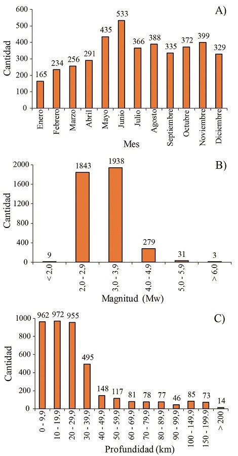 Distribución de los sismos localizados en el 2019 por A) mes, B) magnitud y C) profundidad. La cantidad de sismos se muestra sobre las barras de cada histograma.