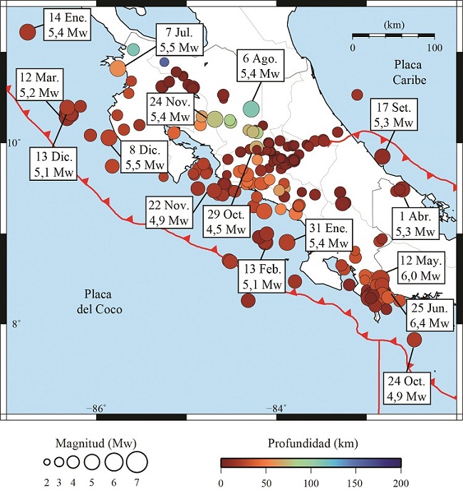 La mayoría de la sismicidad localizados (70,4%) tuvo profundidades menores a los 30 km (Fig. 3C)Figure 3. Un total de 190 eventos superficiales fueron sentidos, lo cual representa el 75,4% del total (Fig. 5C)Figure 5. Solamente 32 sismos sentidos tuvieron su hipocentro a más de 40 km de profundidad y de estos, tres ocurrieron a más de 100 km (Fig 5C)Figure 5. El primero de estos eventos ocurrió el 1 de febrero a 113 km de profundidad, 7 km al sureste de La Cruz en Guanacaste, con una Mw de 4,0. El segundo sucedió el 13 de mayo a 155 km de profundidad (siendo el más profundo), 11 km al noroeste de Aguas Claras de Upala, con una Mw de 3,0. El tercero ocurrió el 6 de agosto a 111 km de profundidad, 2 km al norte de Venecia de San Carlos y una Mw de 5,4.